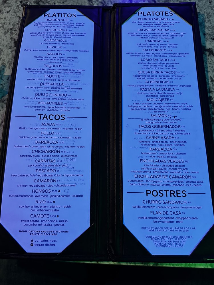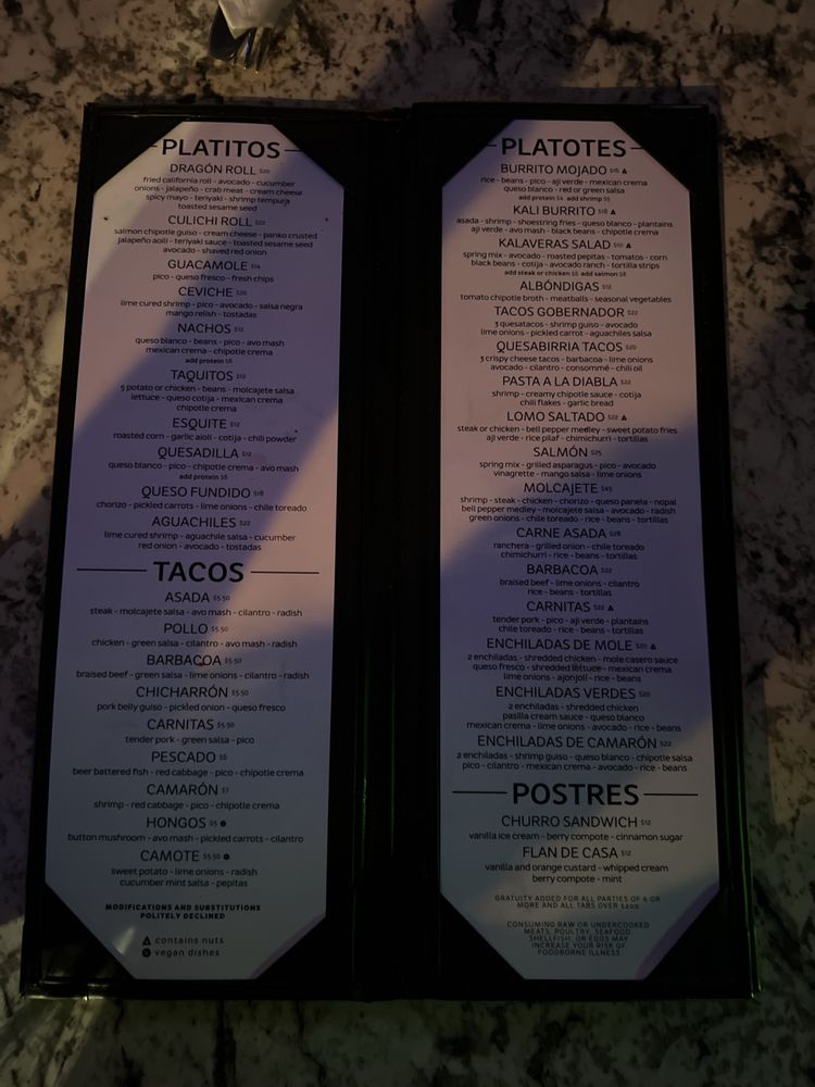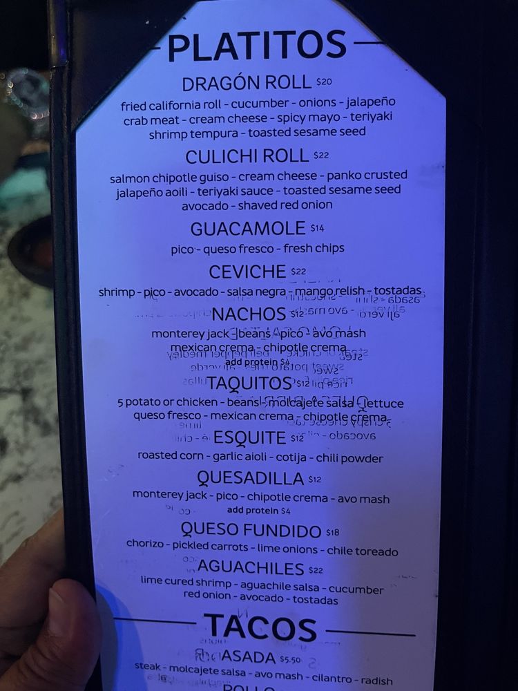 Sushi Rolls Platitos Tacos Postres Margaritas Vodka Whiskey Slushies Mezcal Cocktail Tequila Mezcal Wine By The Glass Wine By The Bottle Classics Speciality Shots Liquor Sides Vodka Cocktails Whiskey Cocktails Drinks DRAFT BEER Michelada BOTTLED BEER Kids Menu Aguas Fresca Rum Lunch Specials Employees Meal Drinks Brunch Cognac Champagne New Specialty Drinks Catering Bottle Service EVENTS VIP EXCLUSIVE BTL SRV Taco Tuesday Buffet Platotes Saturday Brunch Plates Saturday Brunch Drinks Saturday Brunch Sides Happy Hour Food Valentine Cocktails To-Go Margarita Cinco De Mayo Drink Special